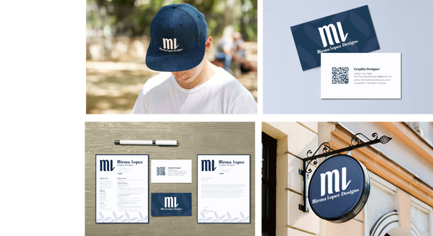 This final business card design translates my brand into a compact, memorable format. The front showcases the bold ML monogram over a subtle midnight-blue pattern, creating a strong visual signature with refined, leaf-inspired texture. The back features a clean, spacious layout with a custom QR code for quick portfolio access. Soft colors and balanced typography keep the design professional and approachable, reflecting my intentional, easy-to-navigate style.
