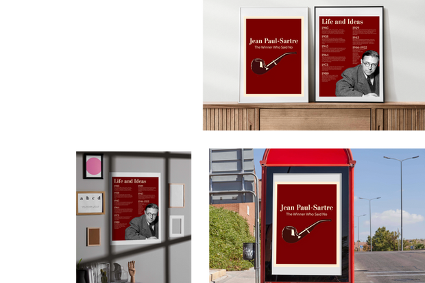 This poster design explores the life and ideas of philosopher Jean-Paul Sartre, the man who won the 1964 Nobel Prize in Literature, and famously refused it. Inspired by his existentialist views on freedom and authenticity, the design takes a clean, timeline-driven approach to visualize his major works, milestones, and unapologetic personality.